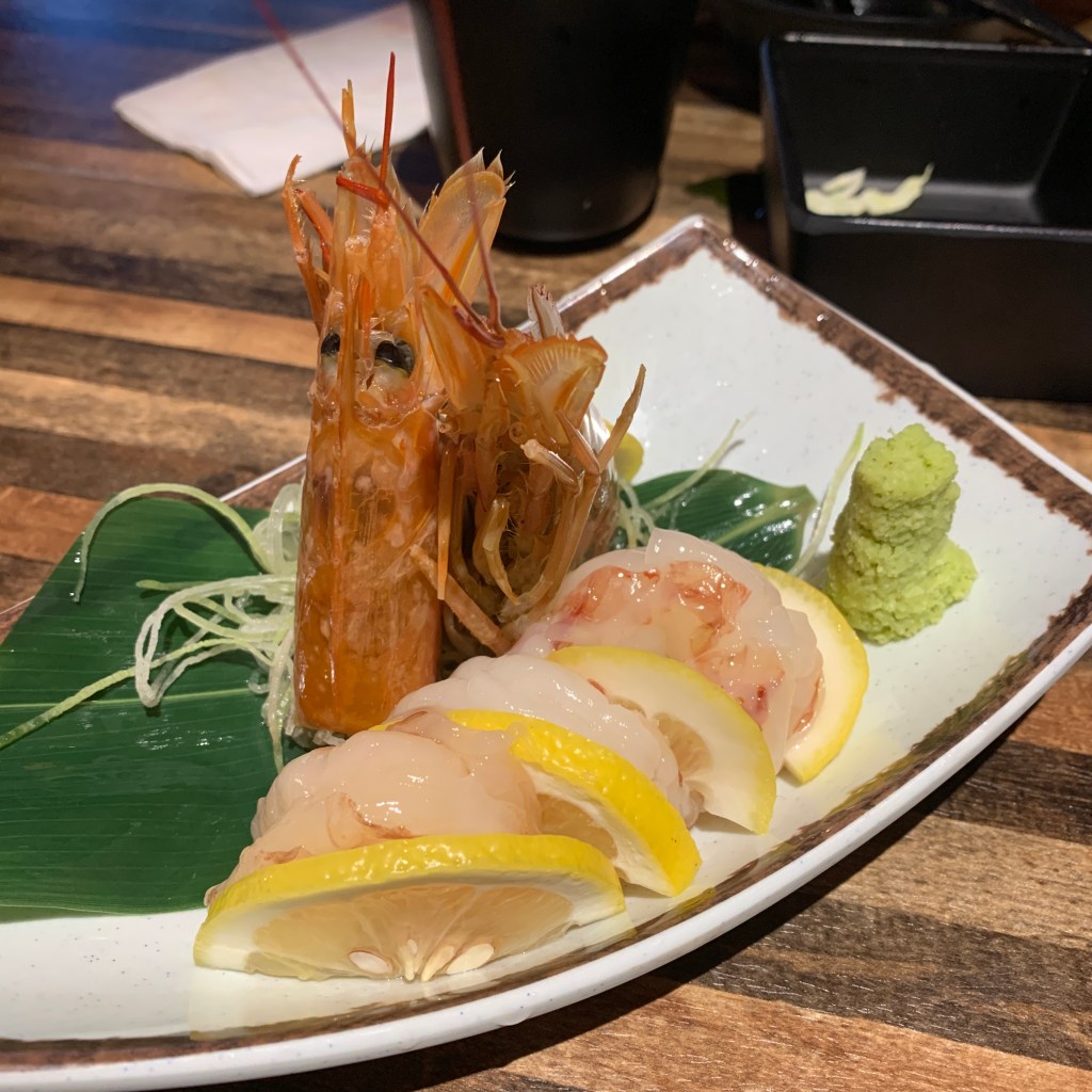 三文魚、吞拿魚、甜蝦刺身 $27三件 / 石蝦刺身 $45