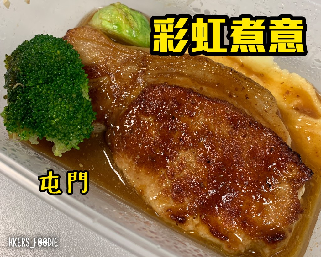 1.5米惡法搞到而家食黃店都一定要買外賣。彩虹煮意喺屯門置樂天橋下面,小編喺午餐餐牌度揀咗食豬肉眼,因為豬肉要煮耐啲嘅關係,呢個餐要等15分鐘左右,咁就有時間去埋九份茶舍幫襯,時間夾得非常好🤣